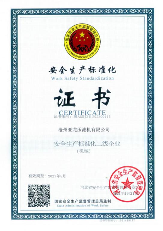 安全生產標準化證書-滄州亞龍壓濾機有限公司