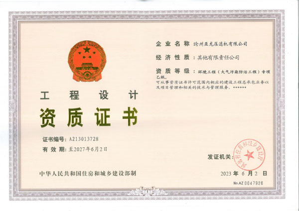 環境工程設計資質證書-滄州亞龍壓濾機有限公司