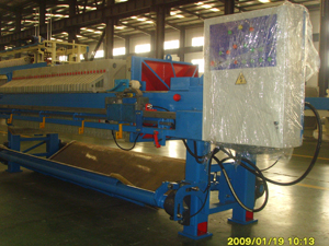 由交替排列的濾板和濾框構成一組濾室。濾板的表面有溝槽,其凸出部位用以支撐濾布。濾框和濾板的邊角上有通孔,組裝后構成完整的通道,能通入懸浮液、洗滌水和引出濾液。板、框兩側各有把手支托在橫梁上,由壓緊裝置壓緊板、框。板、框之間的濾布起密封墊片的作用。由供料泵將懸浮液壓入濾室在濾布上形成濾渣,直至充滿濾室。濾液穿過濾布并沿濾板溝槽流至板框邊角通道,集中排出。過濾完畢,可通入清洗滌水洗滌濾渣。洗滌后,有時還通入壓縮空氣,除去剩余的洗滌液。隨后打開壓濾機卸除濾渣,清洗濾布,重新壓緊板、框,開始下一工作循環。
